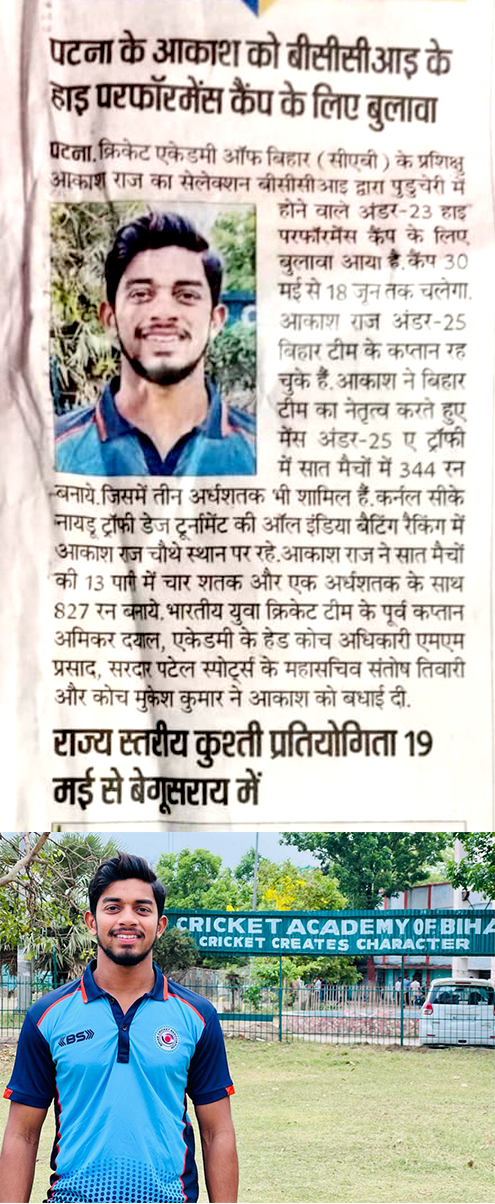 The Board of Cricket Control in India (BCCI) has selected Cricket Academy of Patna (CAB)’s Aakash Raj for the Under -23 high performance camp to be held from May 30- June 18, 2023. Aakash has an exemplary record of captaincy for Under -25 Bihar team where he scored 344 runs in seven matches in the Men’s A category. This record also includes his three half centuries. Aakash holds the fourth position in the all India batting ranking of Cornel C.K. Naidu tournament. Aakash is an inspiration to all the players of the academy.